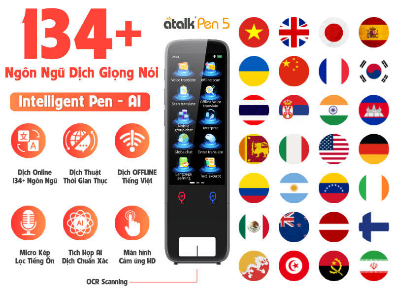 Bút Thông Minh ATalk Pen 5 là thiết bị dịch thuật thế hệ mới, hỗ trợ dịch offline tiếng Việt và nhiều ngôn ngữ khác với độ chính xác 98% và tốc độ 0,5 giây. Tích hợp AI tiên tiến, bút cho phép dịch giọng nói 2 chiều, quét – scan văn bản, dịch hình ảnh, ghi âm và trích xuất nội dung, đáp ứng nhu cầu học tập, làm việc và du lịch mọi lúc, mọi nơi.