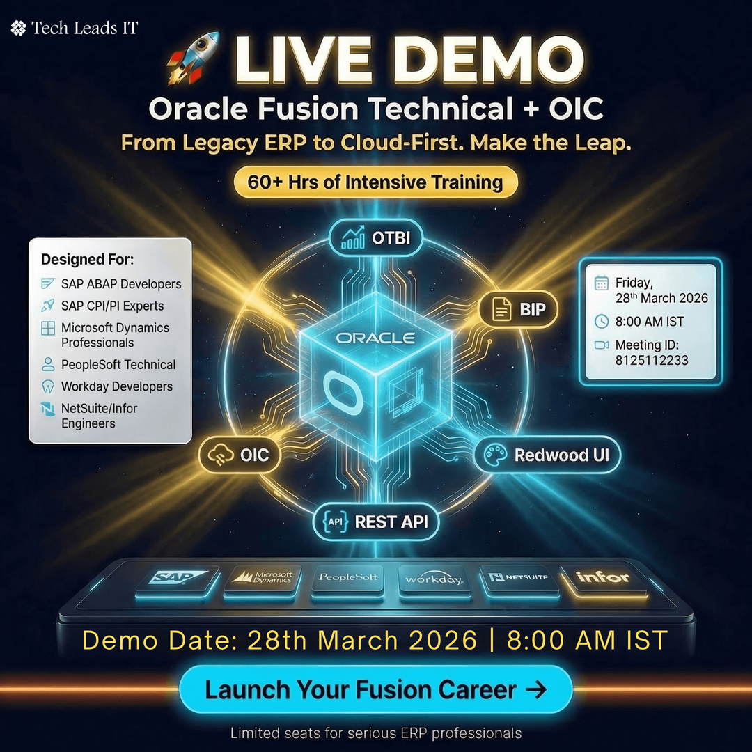 About Tech Leads IT Tech Leads IT delivers industry-focused training in Oracle Fusion Cloud technologies, equipping professionals with practical skills and knowledge to thrive in enterprise cloud careers.